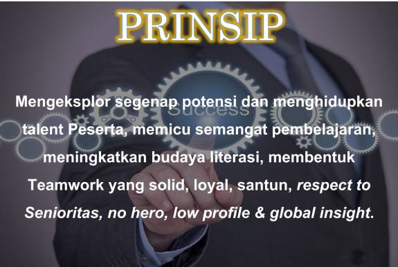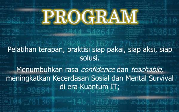 Pelatihan/Seminar & Workshop -- Training program with acceleration system. Sistem percepatan dalam merangsang setiap potensi dan talent Peserta. Dengan Silabus modul/materi yang bersifat intuitif, aplikatif, sistematik, terstruktur & berkesinambungan (sustainable)